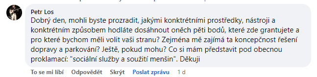 Petr: Dobrý den, mohli byste prozradit, jakými konktrétními prostředky, nástroji a konktrétním způsobem hodláte dosáhnout oněch pěti bodů, které zde grantujete a pro které bychom měli volit vaši stranu? Zejména mě zajímá ta koncepčnost řešení dopravy a parkování? Ještě, pokud mohu? Co si mám představit pod obecnou proklamací: „sociální služby a soužití menšin“. Děkuji